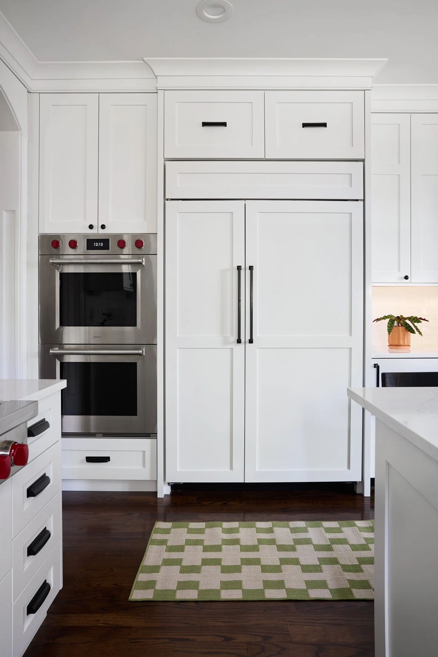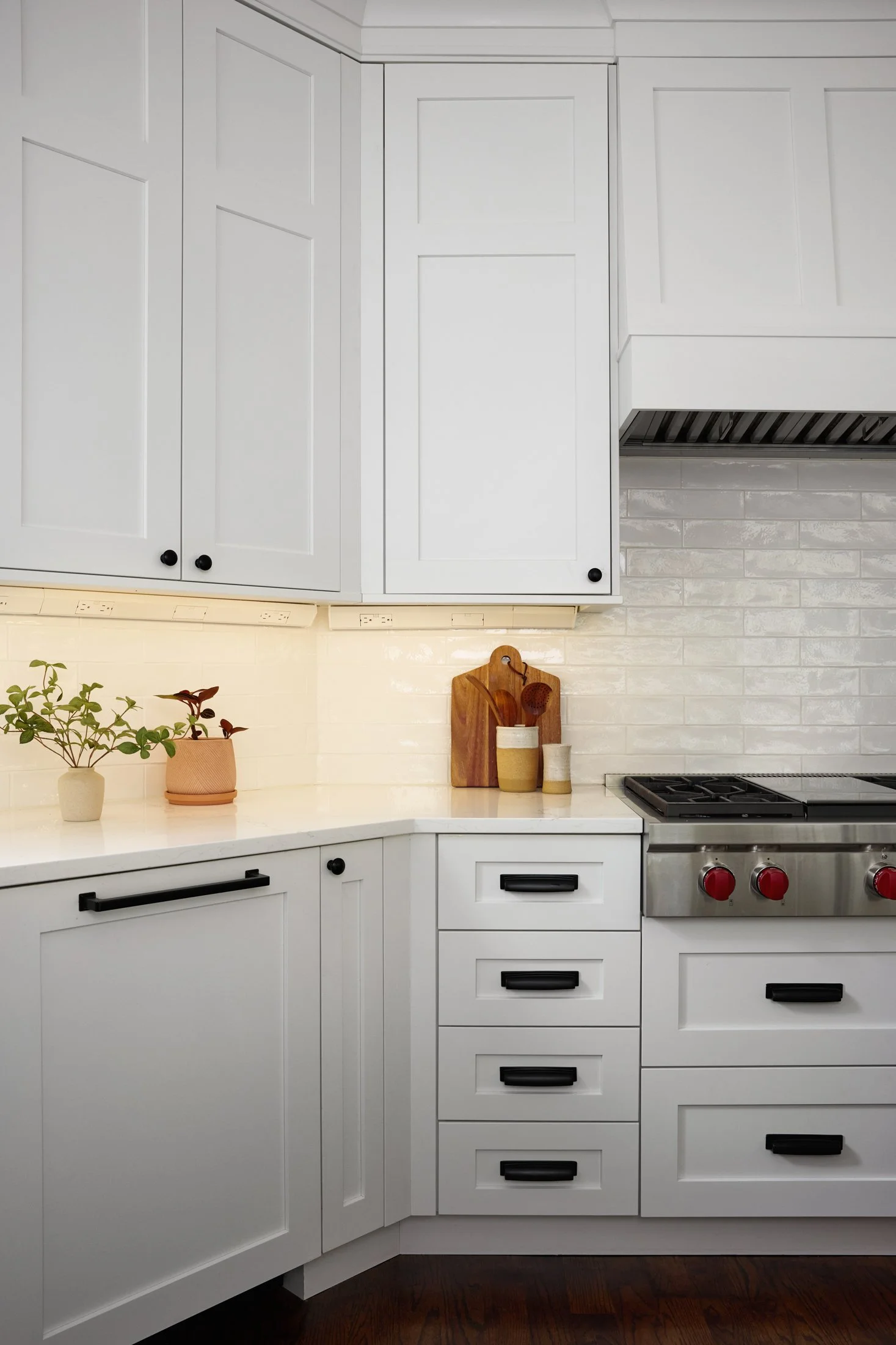 This kitchen is the embodiment of a bright, white kitchen complete with luxury appliances. Built in under-cabinet electrical and LED strip lighting keeps the white tile backsplash distraction free.